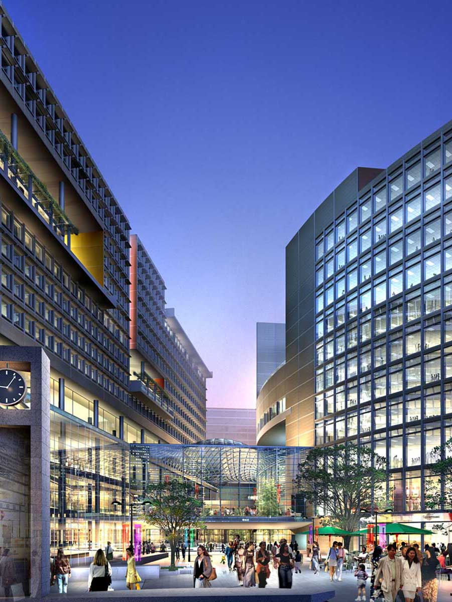该项目包括豪华公寓和经济型公寓、零售店、写字楼、拥有 200 间客房的酒店以及 1,800 多个停车位。 中心是一个大型开放空间,可作为社区市政广场和多层冬季花园。 公寓位于一个四层楼的零售中心之上,设计有多个临街入口。